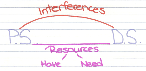 3. Interferences: What might be holding you back? What is interfering in your life that is stopping your Desired State from being your PS. If nothing – then just get on with it! Yet, there might be some unresolved emotions, patterns of thought or behaviour, other people, etc. It is these interferences that you will apply some of the NLP techniques to in order to change or clear the interferences.