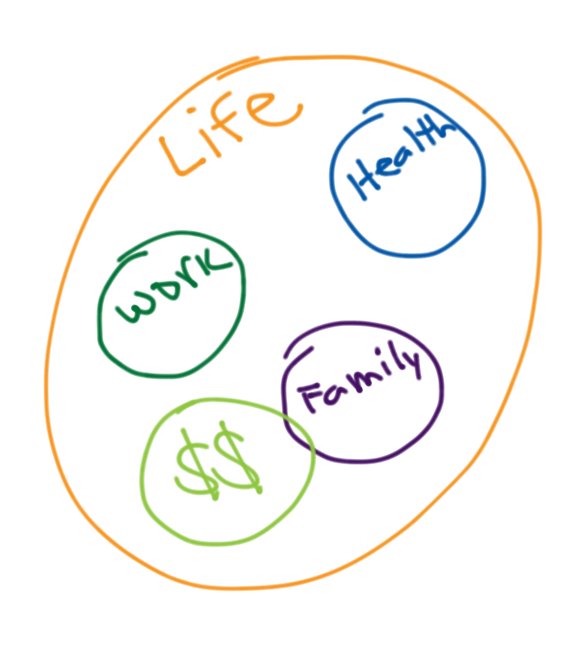 But – isn’t work just a part of life? Its not a separate entity is it? Well, maybe it is, but perhaps its not supposed to be? Maybe its supposed to be LIFE as the main aspect – and then there are subparts to life – like family, work, money, health, etc.  Maybe its supposed to look like this: